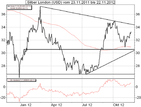 Eine mächtige Aufwärtsbewegung verzeichnete erneut Palladium mit +3%. Unser Stop-Buy-Limit für den Long-Einstieg wird beibehalten (Schlusskurs gestern 657). Silber befestigte die 33er-Marke durch Gewinne um fast 1% weiter, sodass wir unser Long-Engagement unverändert fortsetzen.