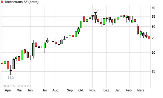 Mit dem Rücksetzer auf 24,90 EUR hat die Technotrans-Aktie (ISIN DE000A0XYGA7) am 19.03.2026 ein neues 6-Monats-Tief erreicht und damit den Kurs vom 17.03.2026 eingestellt.