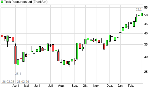 Mit dem Anstieg auf 51,88 EUR hat die Teck Resources-Aktie (ISIN CA8787422044) am 25.02.2026 ein neues All-Time-High erreicht und damit den Kurs vom 12.02.2026 eingestellt.