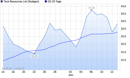 Mit dem Rücksetzer auf 32,43 EUR hat die Teck Resources-Aktie am 13.06.2025 die 20-Tage-Linie nach unten gekreuzt.