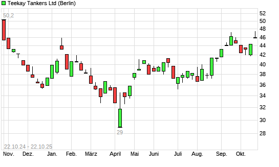 Mit dem Anstieg auf 46,80 EUR hat die Teekay Tankers-Aktie (ISIN BMG8726X1065) am 21.10.2025 ein neues 6-Monats-Hoch erreicht und damit den Kurs vom 16.09.2025 eingestellt.