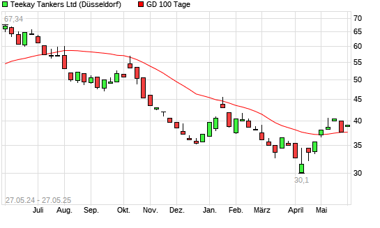 Mit dem Anstieg auf 39,40 EUR hat die Teekay Tankers-Aktie am 26.05.2025 die 100-Tage-Linie nach oben gekreuzt.