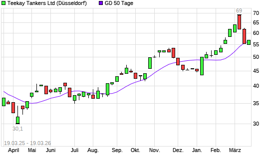 Mit dem Anstieg auf 57,00 EUR hat die Teekay Tankers-Aktie am 18.03.2026 die 50-Tage-Linie nach oben gekreuzt.