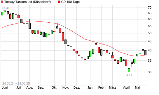 Mit dem Rücksetzer auf 37,20 EUR hat die Teekay Tankers-Aktie am 23.05.2025 die 100-Tage-Linie nach unten gekreuzt.