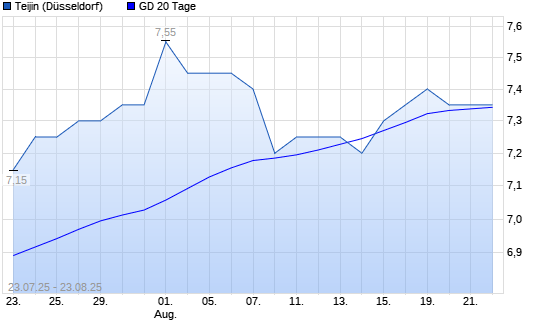 Mit dem Rücksetzer auf 7,35 EUR hat die Teijin-Aktie am 22.08.2025 die 20-Tage-Linie nach unten gekreuzt.