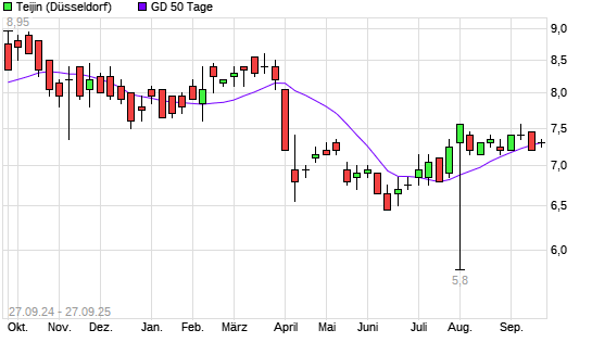Mit dem Rücksetzer auf 7,35 EUR hat die Teijin-Aktie am 26.09.2025 die 50-Tage-Linie nach unten gekreuzt.