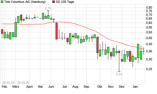 Mit dem Rücksetzer auf 0,35 EUR hat die Tele Columbus-Aktie am 23.01.2025 die 100-Tage-Linie nach unten gekreuzt.