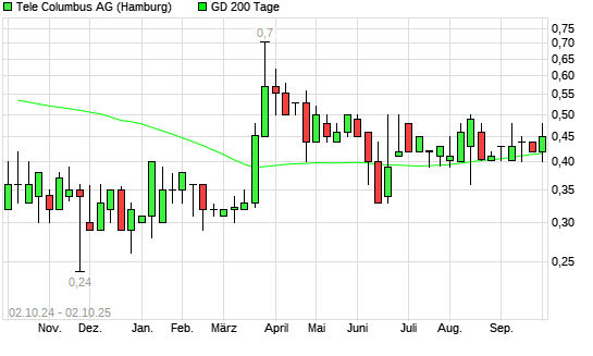Mit dem Rücksetzer auf 0,40 EUR hat die Tele Columbus-Aktie am 01.10.2025 die 200-Tage-Linie nach unten gekreuzt.