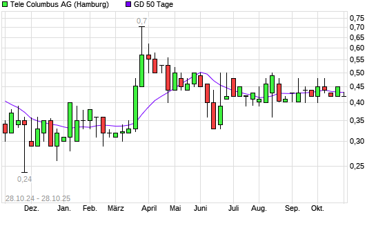Mit dem Rücksetzer auf 0,43 EUR hat die Tele Columbus-Aktie am 27.10.2025 die 50-Tage-Linie nach unten gekreuzt.