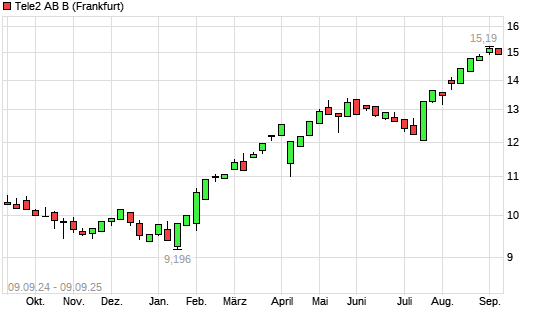 Mit dem Anstieg auf 15,14 EUR hat die Tele2 B-Aktie (ISIN SE0005190238) am 08.09.2025 ein neues 10-Jahres-Hoch erreicht und damit den Kurs vom 05.09.2025 eingestellt.