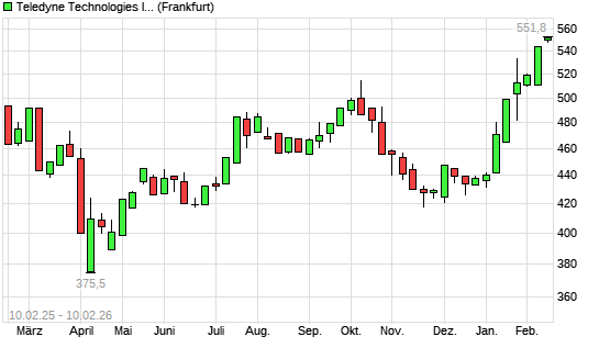 Mit dem Anstieg auf 547,60 EUR hat die Teledyne Technologies-Aktie (ISIN US8793601050) am 09.02.2026 ein neues All-Time-High erreicht und damit den Kurs vom 06.02.2026 eingestellt.