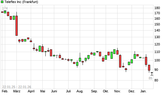 Mit dem Rücksetzer auf 85,00 EUR hat die Teleflex-Aktie (ISIN US8793691069) am 21.01.2026 ein neues 10-Jahres-Tief erreicht und damit den Kurs vom 20.01.2026 eingestellt.