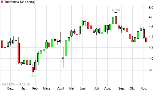 Mit dem Rücksetzer auf 4,30 EUR hat die Telefónica-Aktie (ISIN ES0178430E18) am 03.11.2025 ein neues 6-Monats-Tief erreicht und damit den Kurs vom 14.05.2025 eingestellt.