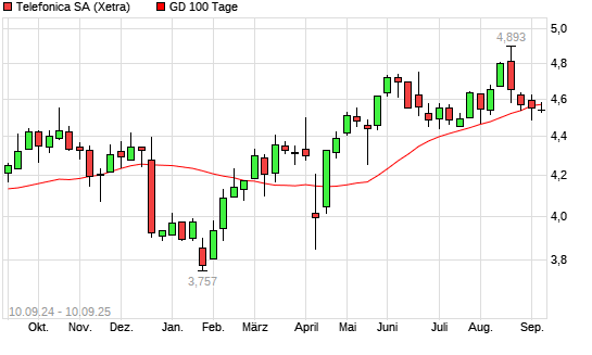 Mit dem Anstieg auf 4,58 EUR hat die Telefónica-Aktie am 09.09.2025 die 100-Tage-Linie nach oben gekreuzt.