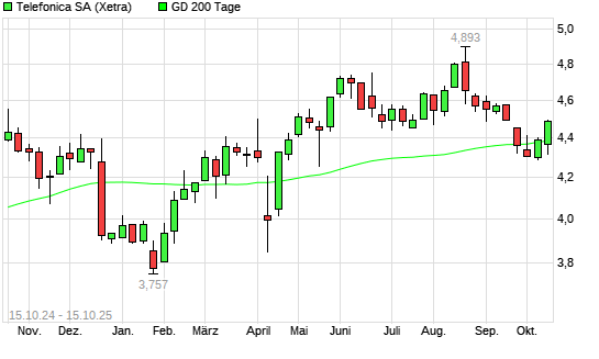 Mit dem Anstieg auf 4,39 EUR hat die Telefónica-Aktie am 14.10.2025 die 200-Tage-Linie nach oben gekreuzt.