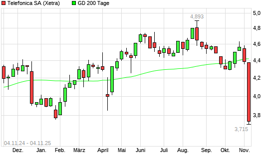 Mit dem Rücksetzer auf 4,30 EUR hat die Telefónica-Aktie am 03.11.2025 die 200-Tage-Linie nach unten gekreuzt.