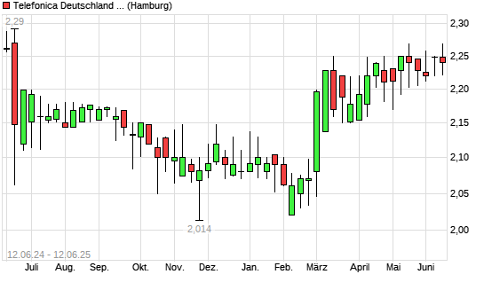 Mit dem Anstieg auf 2,27 EUR hat die Telefonica Deutschland-Aktie (ISIN DE000A1J5RX9) am 11.06.2025 ein neues 6-Monats-Hoch erreicht und damit den Kurs vom 13.05.2025 eingestellt.