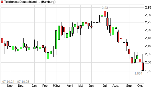 Mit dem Rücksetzer auf 1,96 EUR hat die Telefonica Deutschland-Aktie (ISIN DE000A1J5RX9) am 06.10.2025 ein neues 12-Monats-Tief erreicht und damit den Kurs vom 12.09.2025 eingestellt.Die ...weiterlesen