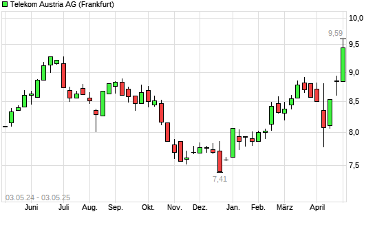 Mit dem Anstieg auf 9,44 EUR hat die Telekom Austria-Aktie (ISIN AT0000720008) am 02.05.2025 ein neues 10-Jahres-Hoch erreicht und damit den Kurs vom 30.04.2025 eingestellt.