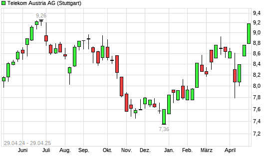 Mit dem Anstieg auf 8,93 EUR hat die Telekom Austria-Aktie (ISIN AT0000720008) am 28.04.2025 ein neues 6-Monats-Hoch erreicht und damit den Kurs vom 25.04.2025 eingestellt.