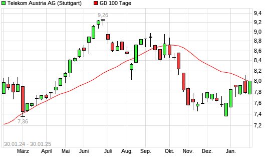 Mit dem Anstieg auf 8,02 EUR hat die Telekom Austria-Aktie am 29.01.2025 die 100-Tage-Linie nach oben gekreuzt.