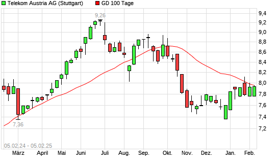 Mit dem Rücksetzer auf 7,91 EUR hat die Telekom Austria-Aktie am 04.02.2025 die 100-Tage-Linie nach unten gekreuzt.