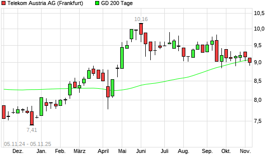 Mit dem Rücksetzer auf 8,98 EUR hat die Telekom Austria-Aktie am 04.11.2025 die 200-Tage-Linie nach unten gekreuzt.