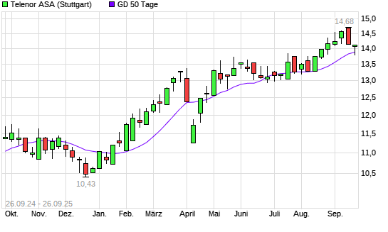 Mit dem Rücksetzer auf 13,82 EUR hat die Telenor-Aktie am 25.09.2025 die 50-Tage-Linie nach unten gekreuzt.