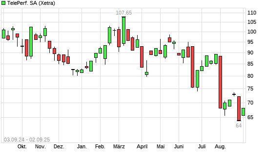 Mit dem Rücksetzer auf 65,64 EUR hat die Teleperformance-Aktie (ISIN FR0000051807) am 02.09.2025 ein neues 5-Jahres-Tief erreicht und damit den Kurs vom 04.08.2025 eingestellt.