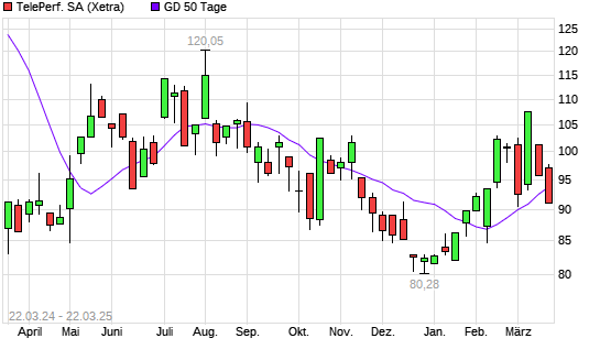 Mit dem Rücksetzer auf 93,38 EUR hat die Teleperformance-Aktie am 21.03.2025 die 50-Tage-Linie nach unten gekreuzt.