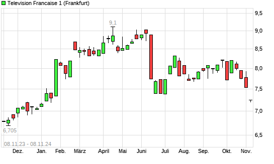 Mit dem Rücksetzer auf 7,21 EUR hat die Television Francaise 1-Aktie (ISIN FR0000054900) am 07.11.2024 ein neues 6-Monats-Tief erreicht und damit den Kurs vom 05.11.2024 eingestellt.