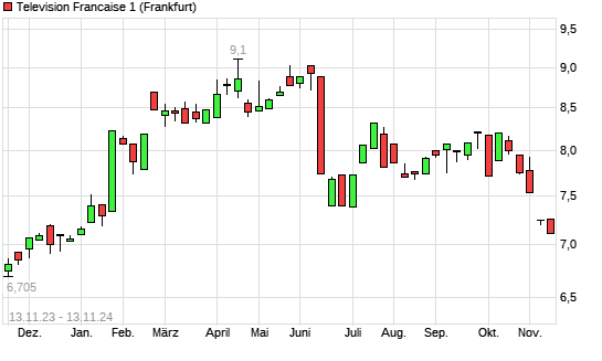 Mit dem Rücksetzer auf 7,18 EUR hat die Television Francaise 1-Aktie (ISIN FR0000054900) am 12.11.2024 ein neues 6-Monats-Tief erreicht und damit den Kurs vom 07.11.2024 eingestellt.