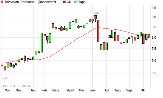 Mit dem Anstieg auf 8,00 EUR hat die Television Francaise 1-Aktie am 18.10.2024 die 100-Tage-Linie nach oben gekreuzt.