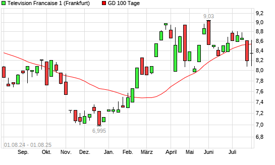 Mit dem Rücksetzer auf 8,53 EUR hat die Television Francaise 1-Aktie am 31.07.2025 die 100-Tage-Linie nach unten gekreuzt.