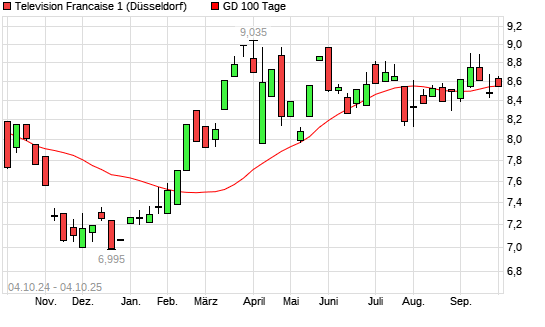 Mit dem Rücksetzer auf 8,52 EUR hat die Television Francaise 1-Aktie am 03.10.2025 die 100-Tage-Linie nach unten gekreuzt.