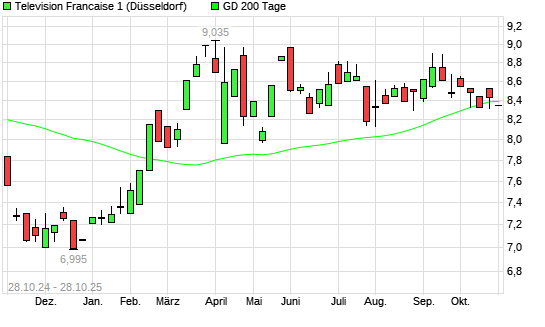 Mit dem Rücksetzer auf 8,33 EUR hat die Television Francaise 1-Aktie am 27.10.2025 die 200-Tage-Linie nach unten gekreuzt.