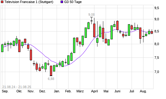 Mit dem Rücksetzer auf 8,50 EUR hat die Television Francaise 1-Aktie am 20.08.2025 die 50-Tage-Linie nach unten gekreuzt.