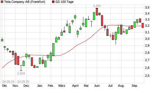 Mit dem Rücksetzer auf 3,18 EUR hat die Telia Company-Aktie am 23.09.2025 die 100-Tage-Linie nach unten gekreuzt.