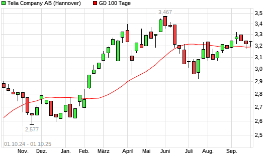 Mit dem Rücksetzer auf 3,19 EUR hat die Telia Company-Aktie am 30.09.2025 die 100-Tage-Linie nach unten gekreuzt.