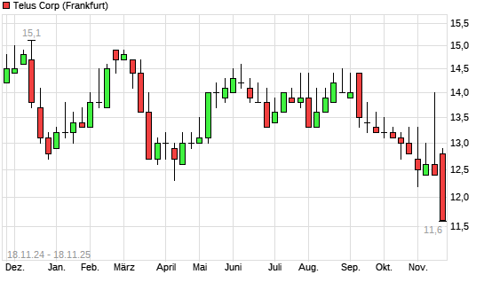 Mit dem Rücksetzer auf 12,20 EUR hat die Telus-Aktie (ISIN CA87971M1032) am 17.11.2025 ein neues All-Time-Low erreicht und damit den Kurs vom 08.04.2025 eingestellt.
