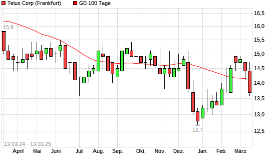 Mit dem Rücksetzer auf 13,70 EUR hat die Telus-Aktie am 12.03.2025 die 100-Tage-Linie nach unten gekreuzt.