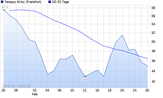 Mit dem Rücksetzer auf 45,40 EUR hat die Tempus AI-Aktie am 25.02.2026 die 20-Tage-Linie nach unten gekreuzt.Der Abstand zur 200-Tage-Linie beträgt aktuell +0,00%.