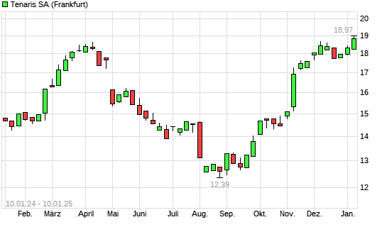 Mit dem Anstieg auf 18,97 EUR hat die Tenaris-Aktie (ISIN LU2598331598) am 09.01.2025 ein neues 10-Jahres-Hoch erreicht und damit den Kurs vom 04.12.2024 eingestellt.