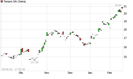 Mit dem Anstieg auf 20,70 EUR hat die Tenaris-Aktie (ISIN LU2598331598) am 16.02.2026 ein neues 10-Jahres-Hoch erreicht und damit den Kurs vom 12.02.2026 eingestellt.