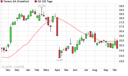 Mit dem Rücksetzer auf 14,70 EUR hat die Tenaris-Aktie am 10.10.2025 die 100-Tage-Linie nach unten gekreuzt.