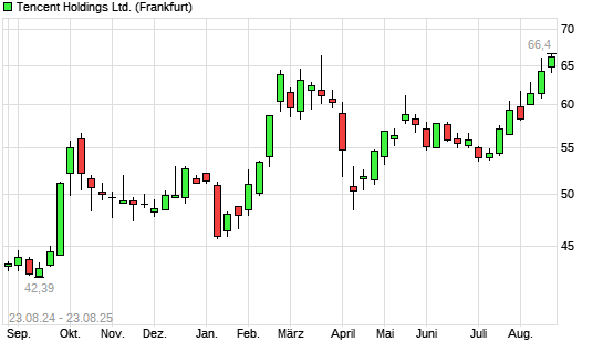Mit dem Anstieg auf 66,11 EUR hat die Tencent-Aktie (ISIN KYG875721634) am 22.08.2025 ein neues 3-Jahres-Hoch erreicht und damit den Kurs vom 13.08.2025 eingestellt.
