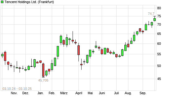 Mit dem Anstieg auf 73,90 EUR hat die Tencent-Aktie (ISIN KYG875721634) am 02.10.2025 ein neues 3-Jahres-Hoch erreicht und damit den Kurs vom 01.10.2025 eingestellt.