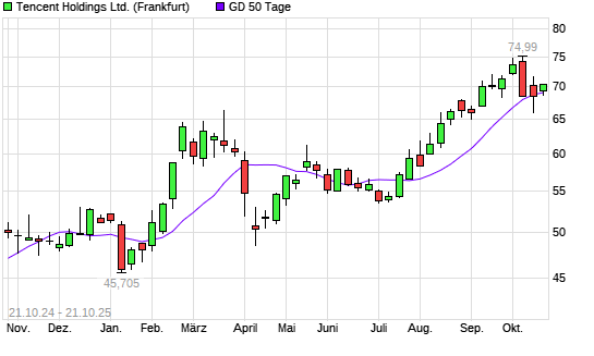Mit dem Anstieg auf 69,73 EUR hat die Tencent-Aktie am 20.10.2025 die 50-Tage-Linie nach oben gekreuzt.