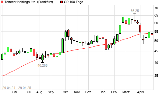 Mit dem Rücksetzer auf 54,00 EUR hat die Tencent-Aktie am 28.04.2025 die 100-Tage-Linie nach unten gekreuzt.