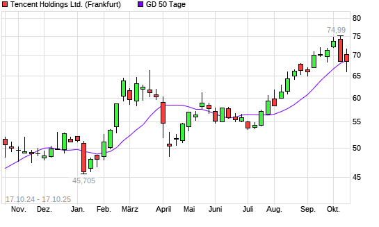 Mit dem Rücksetzer auf 68,13 EUR hat die Tencent-Aktie am 16.10.2025 die 50-Tage-Linie nach unten gekreuzt.